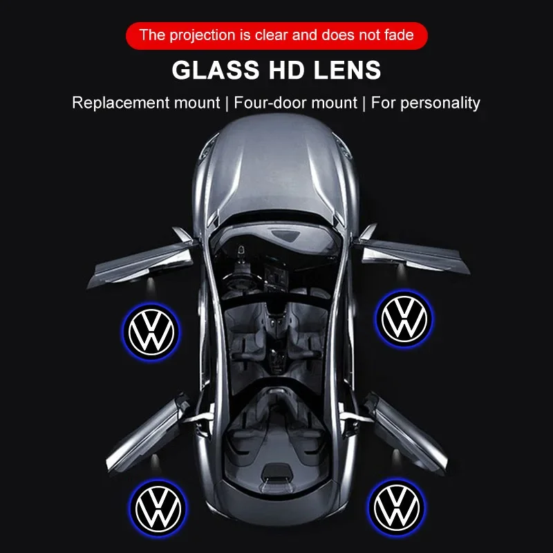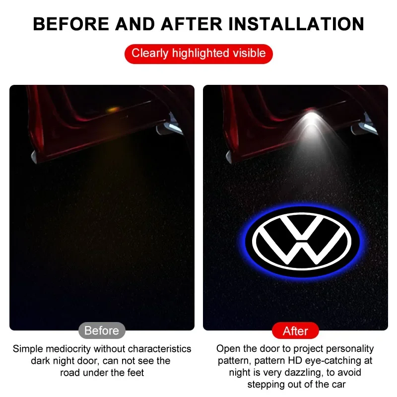 These car door welcome lights bring a stylish and premium touch to your vehicle. When you open the door, they project a clear and bright logo image onto the ground. The HD LED design ensures sharp, vibrant lighting with low power consumption. Specifically made for Volkswagen models like Polo, Passat B5, B6, B7, T4, and T5, they guarantee a precise fit. Installation is quick and requires no drilling or special tools. The courtesy lights improve visibility when stepping in or out at night. They also add a unique, customized look to your car’s appearance. Built from durable materials, they are resistant to heat and long-term use. The lights automatically switch on and off with the door action. Upgrade your Volkswagen with these functional and eye-catching LED projector welcome lights.